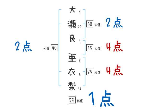 天運![]() | 大瀬良亜衣梨さんの天運は30画の2つ星!浮き沈みの激しさに注意しましょう。 家系が持つ宿命的な運勢を表します。祖先から受け継いだ苗字ですので自分の力が及びません。家柄を象徴します。 |