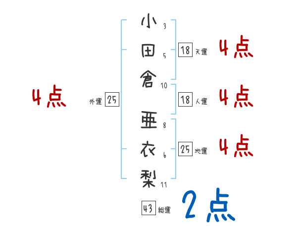 天運![]() | 小田倉亜衣梨さんの天運は18画の4つ星!情熱的で剛気。忍耐力があり信頼される。 家系が持つ宿命的な運勢を表します。祖先から受け継いだ苗字ですので自分の力が及びません。家柄を象徴します。 |