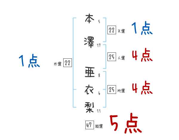 天運![]() | 本澤亜衣梨さんの天運は22画の1つ星!努力することが苦手ないっぽう手先が器用。芸術性にも優れる。 家系が持つ宿命的な運勢を表します。祖先から受け継いだ苗字ですので自分の力が及びません。家柄を象徴します。 |