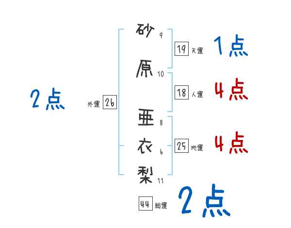 外運![]() | 砂原亜衣梨さんの外運は26画の2つ星!波瀾万丈かも。信頼できる人を大事にしましょう。 生活面を象徴する運勢です。外部から受ける影響力を表し、結婚運、家庭運や職場、環境への順応性を表します。 |