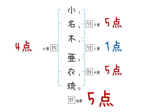 総運![]() | 小名木亜衣琉さんの総運は37画の5つ星!努力家で順応性に優れる。現実的な考え方ができ忠実に物事をこなす。 あなたの人生を表す1番重要な運勢です。生涯を通じて影響する総合運となり、主に50歳以降の晩年期に影響を及ぼします。 |