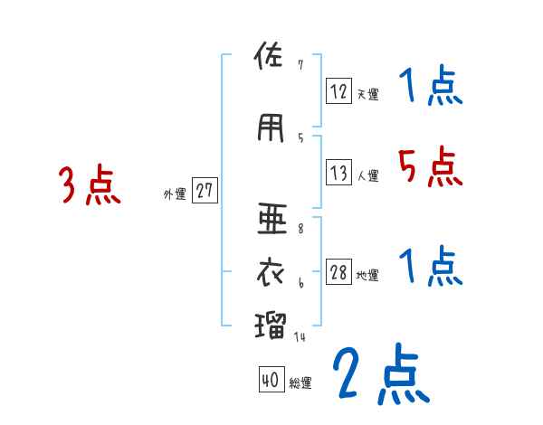 外運![]() | 佐用亜衣瑠さんの外運は27画の3つ星!頭脳明晰だが強情で摩擦が多い傾向。孤立に注意。 生活面を象徴する運勢です。外部から受ける影響力を表し、結婚運、家庭運や職場、環境への順応性を表します。 |