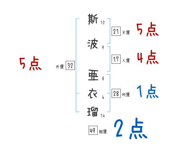 外運![]() | 斯波亜衣瑠さんの外運は32画の5つ星!柔軟性があり成功する。チャンスが多く金運が良い。 生活面を象徴する運勢です。外部から受ける影響力を表し、結婚運、家庭運や職場、環境への順応性を表します。 |