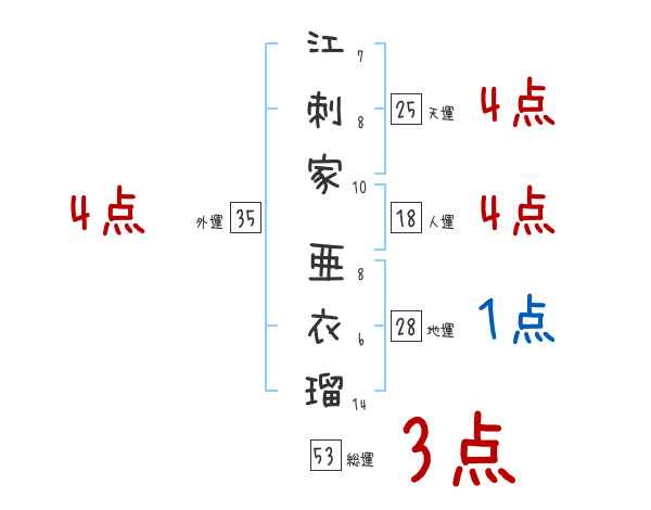 外運![]() | 江刺家亜衣瑠さんの外運は35画の4つ星!温厚な性格で感受性が高い。穏和な性格で人望が厚い。 生活面を象徴する運勢です。外部から受ける影響力を表し、結婚運、家庭運や職場、環境への順応性を表します。 |