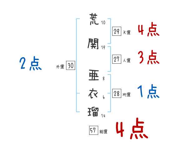 天運![]() | 荒関亜衣瑠さんの天運は29画の4つ星!完全主義で才能がある。厳格な心の持ち主。 家系が持つ宿命的な運勢を表します。祖先から受け継いだ苗字ですので自分の力が及びません。家柄を象徴します。 |