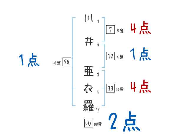 外運![]() | 川井亜衣羅さんの外運は28画の1つ星!家庭環境に注意。スポーツで活躍できる能力があるかも。 生活面を象徴する運勢です。外部から受ける影響力を表し、結婚運、家庭運や職場、環境への順応性を表します。 |
