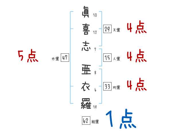 外運![]() | 眞喜志亜衣羅さんの外運は47画の5つ星!実力が開花し発展する円満な人生。財に恵まれる。 生活面を象徴する運勢です。外部から受ける影響力を表し、結婚運、家庭運や職場、環境への順応性を表します。 |