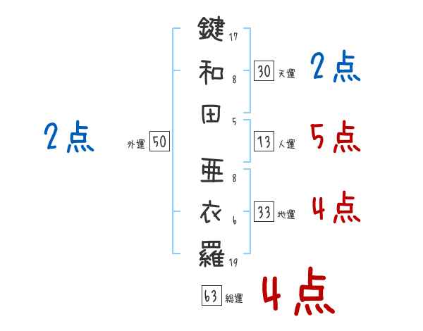総運![]() | 鍵和田亜衣羅さんの総運は63画の4つ星!家庭運がよく順調な生活。温和な性格。 あなたの人生を表す1番重要な運勢です。生涯を通じて影響する総合運となり、主に50歳以降の晩年期に影響を及ぼします。 |