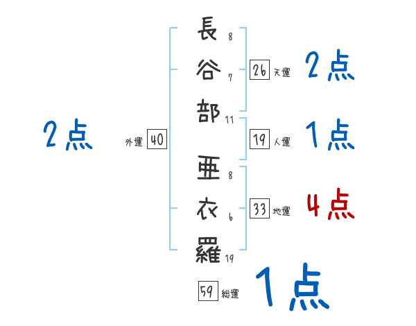 天運![]() | 長谷部亜衣羅さんの天運は26画の2つ星!波瀾万丈かも。信頼できる人を大事にしましょう。 家系が持つ宿命的な運勢を表します。祖先から受け継いだ苗字ですので自分の力が及びません。家柄を象徴します。 |