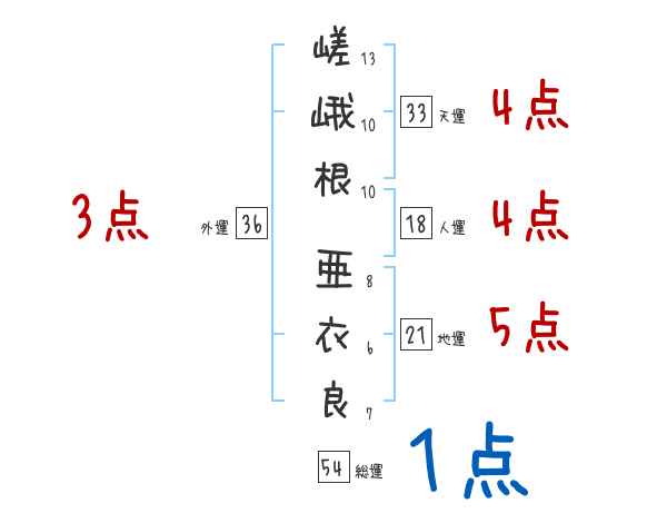 外運![]() | 嵯峨根亜衣良さんの外運は36画の3つ星!先見性が豊かです。多少神経質で苦労することも。 生活面を象徴する運勢です。外部から受ける影響力を表し、結婚運、家庭運や職場、環境への順応性を表します。 |