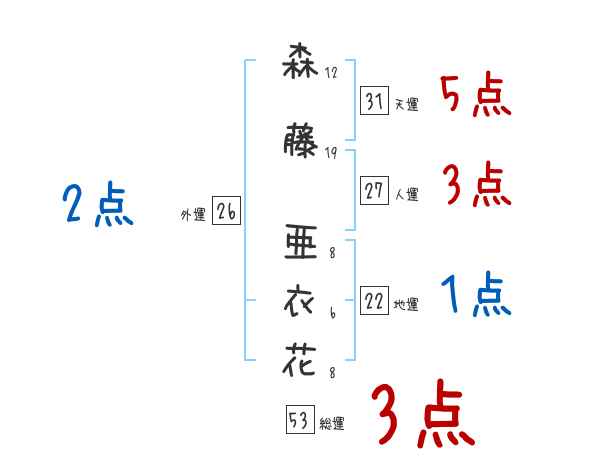 外運![]() | 森藤亜衣花さんの外運は26画の2つ星!波瀾万丈かも。信頼できる人を大事にしましょう。 生活面を象徴する運勢です。外部から受ける影響力を表し、結婚運、家庭運や職場、環境への順応性を表します。 |