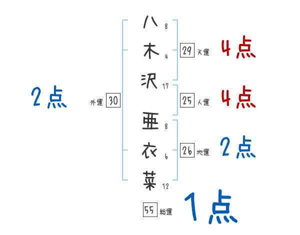 天運![]() | 八木沢亜衣菜さんの天運は29画の4つ星!完全主義で才能がある。厳格な心の持ち主。 家系が持つ宿命的な運勢を表します。祖先から受け継いだ苗字ですので自分の力が及びません。家柄を象徴します。 |