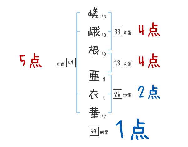 総運![]() | 嵯峨根亜衣華さんの総運は59画の1つ星!意志の弱さであきらめることが多いかも。粘り強さが必要。 あなたの人生を表す1番重要な運勢です。生涯を通じて影響する総合運となり、主に50歳以降の晩年期に影響を及ぼします。 |