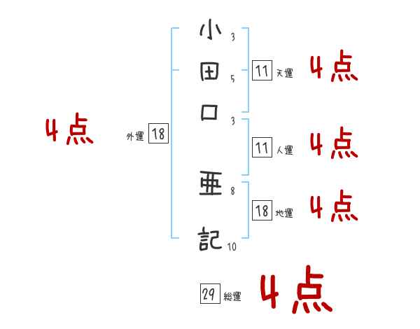 天運![]() | 小田口亜記さんの天運は11画の4つ星!着実に富や地位を得る幸運な人生。 家系が持つ宿命的な運勢を表します。祖先から受け継いだ苗字ですので自分の力が及びません。家柄を象徴します。 |
