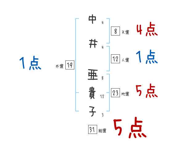 総運![]() | 中井亜貴子さんの総運は31画の5つ星!社交性があり判断力に優れる。順風満帆な人生で円満な生活。 あなたの人生を表す1番重要な運勢です。生涯を通じて影響する総合運となり、主に50歳以降の晩年期に影響を及ぼします。 |