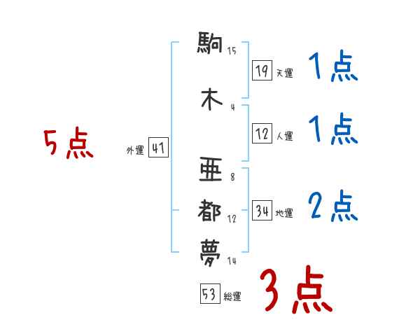 総運![]() | 駒木亜都夢さんの総運は53画の3つ星!やや見栄っ張りで虚栄心がある。散財に注意。 あなたの人生を表す1番重要な運勢です。生涯を通じて影響する総合運となり、主に50歳以降の晩年期に影響を及ぼします。 |