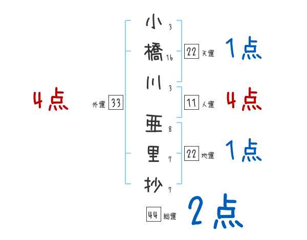 外運![]() | 小橋川亜里抄さんの外運は33画の4つ星!権力志向でプライドが高い。勇気があり運を切り開き成功する。 生活面を象徴する運勢です。外部から受ける影響力を表し、結婚運、家庭運や職場、環境への順応性を表します。 |
