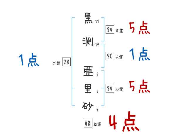 天運![]() | 黒渕亜里砂さんの天運は24画の5つ星!家庭運が良く順調な人生。金運にも恵まれる。 家系が持つ宿命的な運勢を表します。祖先から受け継いだ苗字ですので自分の力が及びません。家柄を象徴します。 |