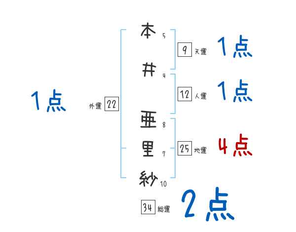 人運![]() | 本井亜里紗さんの人運は12画の1つ星!簡単な失敗で諦めてしまいやすいかも。着実に行動すると良いでしょう。 性格や才能などを表す2番目に重要な運勢です。人間関係や協調性、社会的な成功に影響します。主に20歳から50歳ぐらいまでの中年期の運勢を表します。 |