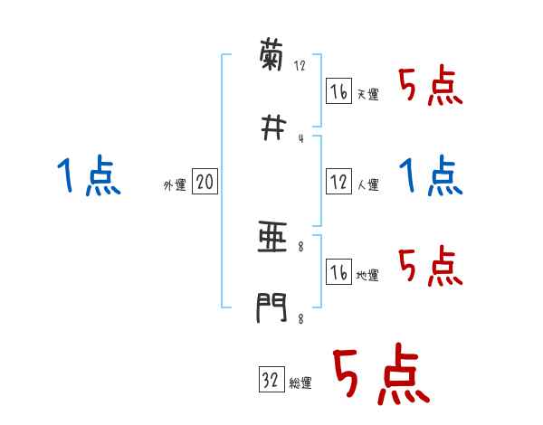総運![]() | 菊井亜門さんの総運は32画の5つ星!柔軟性があり成功する。チャンスが多く金運が良い。 あなたの人生を表す1番重要な運勢です。生涯を通じて影響する総合運となり、主に50歳以降の晩年期に影響を及ぼします。 |