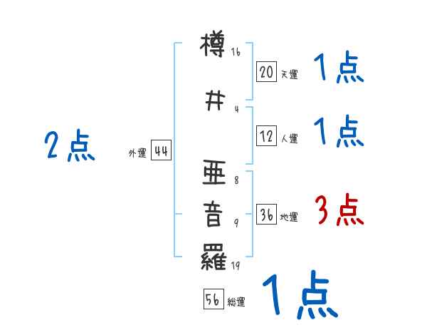 地運![]() | 樽井亜音羅さんの地運は36画の3つ星!先見性が豊かです。多少神経質で苦労することも。 個性を表す基礎的な運勢です。性格形成や対人関係、行動力など家庭環境に影響されます。主に誕生してから20歳くらいまでの若年期の運勢を表します。 |