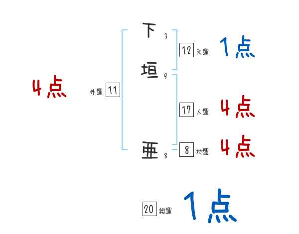 天運![]() | 下垣亜さんの天運は12画の1つ星!簡単な失敗で諦めてしまいやすいかも。着実に行動すると良いでしょう。 家系が持つ宿命的な運勢を表します。祖先から受け継いだ苗字ですので自分の力が及びません。家柄を象徴します。 |