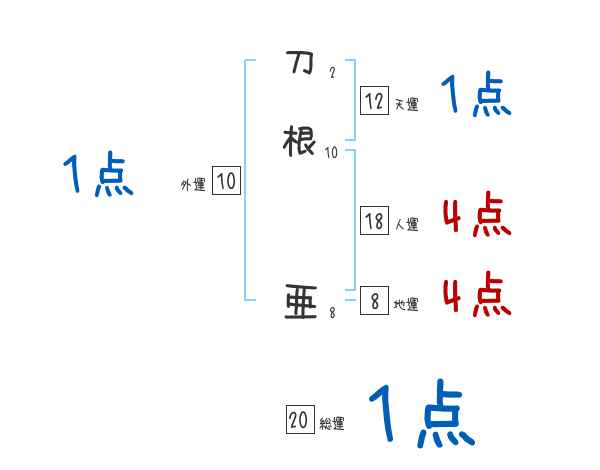 天運![]() | 刀根亜さんの天運は12画の1つ星!簡単な失敗で諦めてしまいやすいかも。着実に行動すると良いでしょう。 家系が持つ宿命的な運勢を表します。祖先から受け継いだ苗字ですので自分の力が及びません。家柄を象徴します。 |