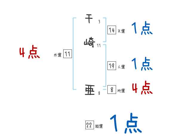 天運![]() | 千崎亜さんの天運は14画の1つ星!人に対して優しいがストレスを溜め込みがち。人間関係のトラブルを避けるよう気をつけましょう。 家系が持つ宿命的な運勢を表します。祖先から受け継いだ苗字ですので自分の力が及びません。家柄を象徴します。 |