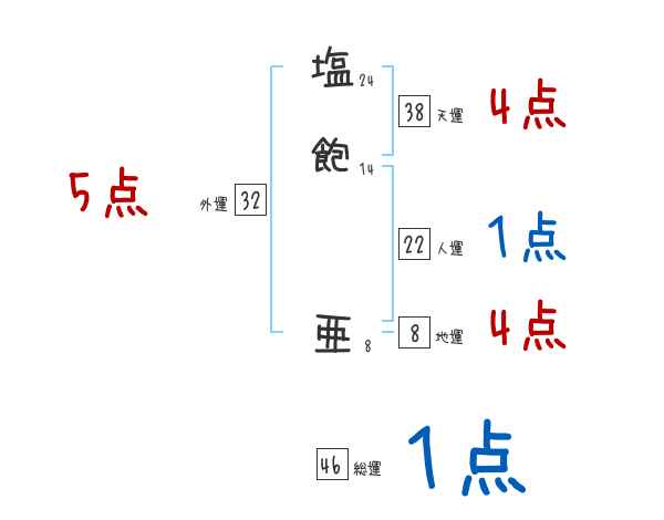 外運![]() | 塩飽亜さんの外運は32画の5つ星!柔軟性があり成功する。チャンスが多く金運が良い。 生活面を象徴する運勢です。外部から受ける影響力を表し、結婚運、家庭運や職場、環境への順応性を表します。 |