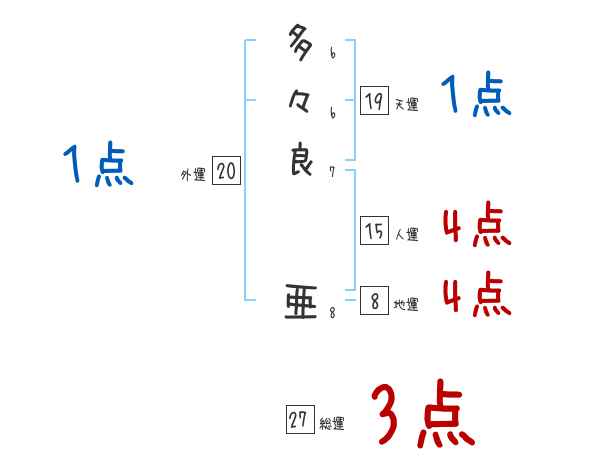 天運![]() | 多々良亜さんの天運は19画の1つ星!優れた才能を持ちますが、協調性が足りないことも。周りの人と協力する事を意識しましょう。 家系が持つ宿命的な運勢を表します。祖先から受け継いだ苗字ですので自分の力が及びません。家柄を象徴します。 |