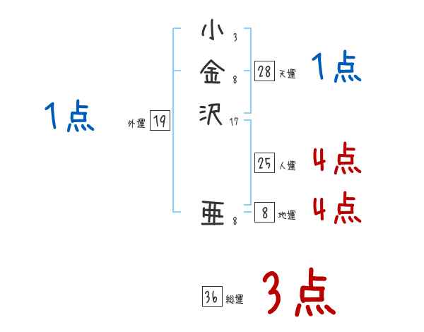 総運![]() | 小金沢亜さんの総運は36画の3つ星!先見性が豊かです。多少神経質で苦労することも。 あなたの人生を表す1番重要な運勢です。生涯を通じて影響する総合運となり、主に50歳以降の晩年期に影響を及ぼします。 |