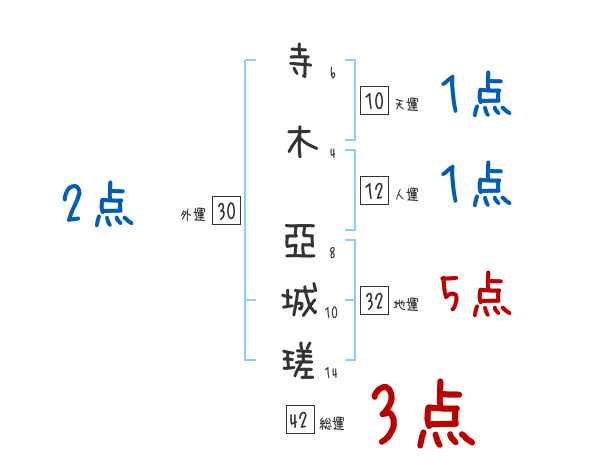 総運![]() | 寺木亞城瑳さんの総運は42画の3つ星!病気に注意。多芸であるが消極的でおとなしい。 あなたの人生を表す1番重要な運勢です。生涯を通じて影響する総合運となり、主に50歳以降の晩年期に影響を及ぼします。 |