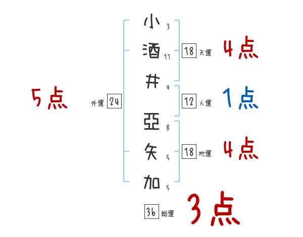 総運![]() | 小酒井亞矢加さんの総運は36画の3つ星!先見性が豊かです。多少神経質で苦労することも。 あなたの人生を表す1番重要な運勢です。生涯を通じて影響する総合運となり、主に50歳以降の晩年期に影響を及ぼします。 |
