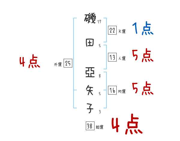 天運![]() | 磯田亞矢子さんの天運は22画の1つ星!努力することが苦手ないっぽう手先が器用。芸術性にも優れる。 家系が持つ宿命的な運勢を表します。祖先から受け継いだ苗字ですので自分の力が及びません。家柄を象徴します。 |