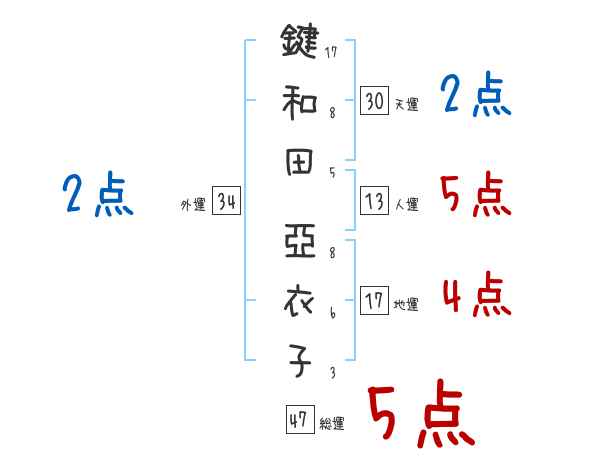 総運![]() | 鍵和田亞衣子さんの総運は47画の5つ星!実力が開花し発展する円満な人生。財に恵まれる。 あなたの人生を表す1番重要な運勢です。生涯を通じて影響する総合運となり、主に50歳以降の晩年期に影響を及ぼします。 |