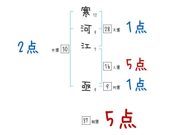 天運![]() | 寒河江亟さんの天運は28画の1つ星!家庭環境に注意。スポーツで活躍できる能力があるかも。 家系が持つ宿命的な運勢を表します。祖先から受け継いだ苗字ですので自分の力が及びません。家柄を象徴します。 |
