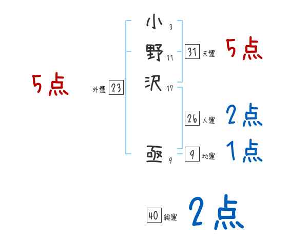 外運![]() | 小野沢亟さんの外運は23画の5つ星!想像力に優れ活力がある。一代で成功し名誉を手に入れる。 生活面を象徴する運勢です。外部から受ける影響力を表し、結婚運、家庭運や職場、環境への順応性を表します。 |
