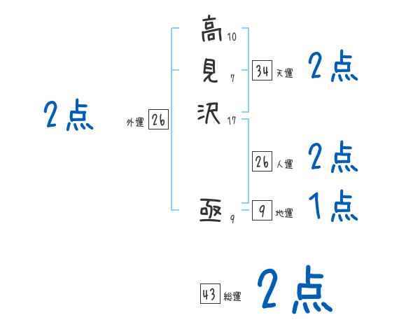 外運![]() | 高見沢亟さんの外運は26画の2つ星!波瀾万丈かも。信頼できる人を大事にしましょう。 生活面を象徴する運勢です。外部から受ける影響力を表し、結婚運、家庭運や職場、環境への順応性を表します。 |