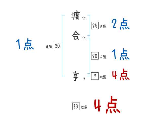 総運![]() | 渡会亨さんの総運は33画の4つ星!権力志向でプライドが高い。勇気があり運を切り開き成功する。 あなたの人生を表す1番重要な運勢です。生涯を通じて影響する総合運となり、主に50歳以降の晩年期に影響を及ぼします。 |
