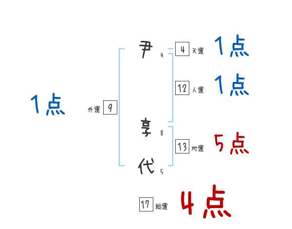 天運![]() | 尹享代さんの天運は4画の1つ星!感情が不安定で苦労するかも。周囲との協調を心掛けましょう。 家系が持つ宿命的な運勢を表します。祖先から受け継いだ苗字ですので自分の力が及びません。家柄を象徴します。 |