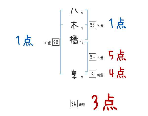 天運![]() | 八木橋享さんの天運は28画の1つ星!家庭環境に注意。スポーツで活躍できる能力があるかも。 家系が持つ宿命的な運勢を表します。祖先から受け継いだ苗字ですので自分の力が及びません。家柄を象徴します。 |