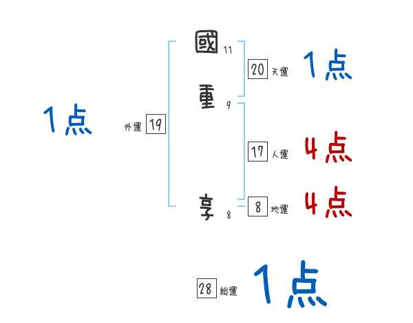 総運![]() | 國重享さんの総運は28画の1つ星!家庭環境に注意。スポーツで活躍できる能力があるかも。 あなたの人生を表す1番重要な運勢です。生涯を通じて影響する総合運となり、主に50歳以降の晩年期に影響を及ぼします。 |