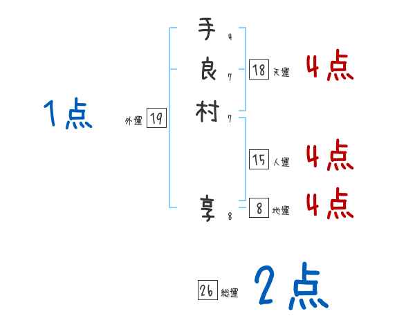 天運![]() | 手良村享さんの天運は18画の4つ星!情熱的で剛気。忍耐力があり信頼される。 家系が持つ宿命的な運勢を表します。祖先から受け継いだ苗字ですので自分の力が及びません。家柄を象徴します。 |
