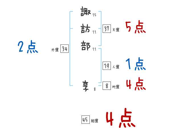 外運![]() | 諏訪部享さんの外運は34画の2つ星!独創性に優れるが、自尊心が強く災難に注意しましょう。 生活面を象徴する運勢です。外部から受ける影響力を表し、結婚運、家庭運や職場、環境への順応性を表します。 |
