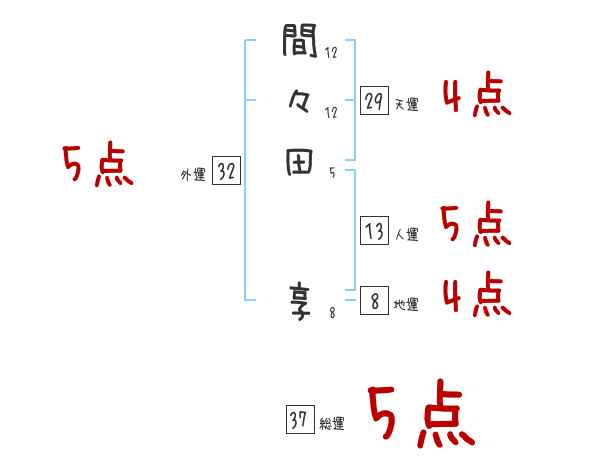 外運![]() | 間々田享さんの外運は32画の5つ星!柔軟性があり成功する。チャンスが多く金運が良い。 生活面を象徴する運勢です。外部から受ける影響力を表し、結婚運、家庭運や職場、環境への順応性を表します。 |