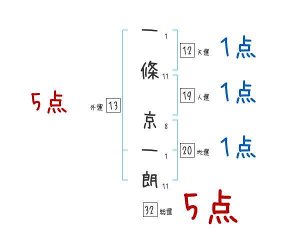 総運![]() | 一條京一朗さんの総運は32画の5つ星!柔軟性があり成功する。チャンスが多く金運が良い。 あなたの人生を表す1番重要な運勢です。生涯を通じて影響する総合運となり、主に50歳以降の晩年期に影響を及ぼします。 |