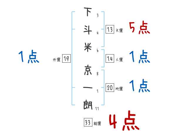 外運![]() | 下斗米京一朗さんの外運は19画の1つ星!優れた才能を持ちますが、協調性が足りないことも。周りの人と協力する事を意識しましょう。 生活面を象徴する運勢です。外部から受ける影響力を表し、結婚運、家庭運や職場、環境への順応性を表します。 |