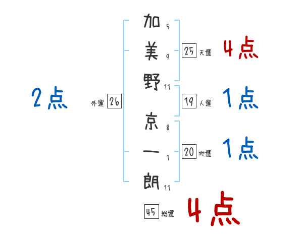 天運![]() | 加美野京一朗さんの天運は25画の4つ星!個性があり才能があふれる。強運の持ち主で発展する。 家系が持つ宿命的な運勢を表します。祖先から受け継いだ苗字ですので自分の力が及びません。家柄を象徴します。 |