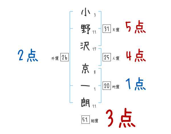 外運![]() | 小野沢京一朗さんの外運は26画の2つ星!波瀾万丈かも。信頼できる人を大事にしましょう。 生活面を象徴する運勢です。外部から受ける影響力を表し、結婚運、家庭運や職場、環境への順応性を表します。 |