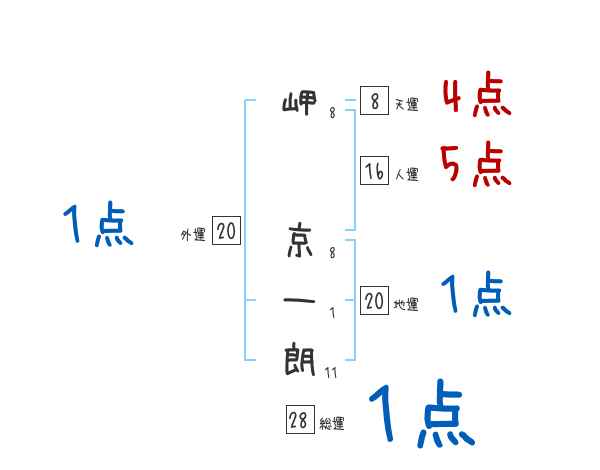 総運![]() | 岬京一朗さんの総運は28画の1つ星!家庭環境に注意。スポーツで活躍できる能力があるかも。 あなたの人生を表す1番重要な運勢です。生涯を通じて影響する総合運となり、主に50歳以降の晩年期に影響を及ぼします。 |
